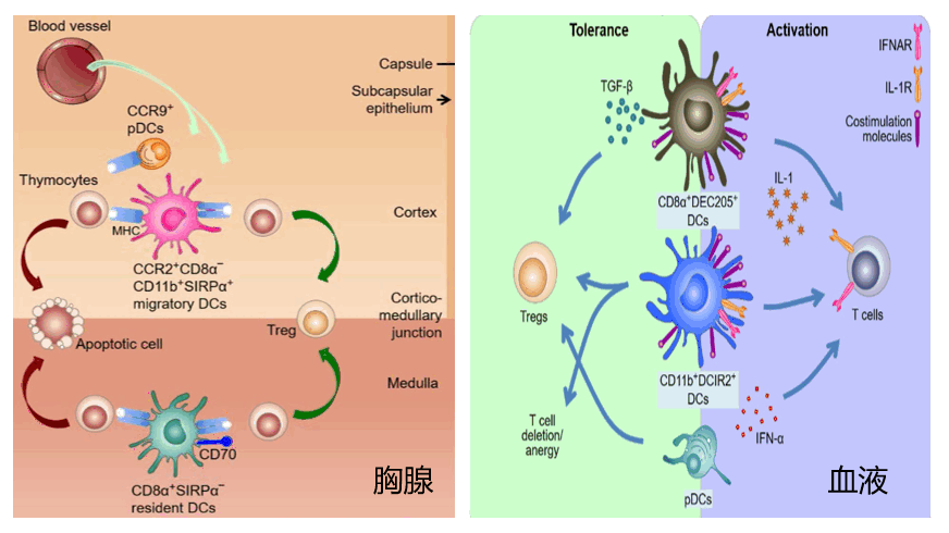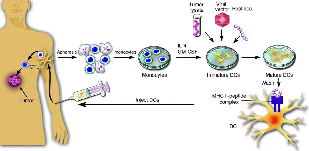 说到DC就不得不提到另一个熟悉的陌生词——“抗原”。 抗原(Antigen)是指能够刺激机体产生免疫反应,并能与免疫应答产物(抗体或致敏淋巴细胞)发生特异性结合的物质。简单来说就是:抗原是被免疫系统定义的一类“标签“,这个标签的含义是”通缉、无论生死”。 大多数时候,我们的身体就如一个和平的港口,井然有序的交易运作,但这只是表面,黑暗中也有一些“不法分子”在伺机而动。负责监视这些“不法分子”的是免疫细胞,更准确来说,是先天免疫细胞。这一类免疫细胞勤恳但能力有限,遇到棘手的敌人时,只能救助于高层军队——特异性免疫细胞(主要为T、B淋巴细胞)。 然而,T、B细胞平时并不出动,需要有细胞把消息传达给他们,而DC细胞就是这传达消息的士兵。但T、B细胞也不是仅靠几句风吹草动就会行动的,出军需要凭证,因此DC细胞要先把敌人“无论生死”的标签,即抗原抢来,送到T、B细胞面前,一次围剿作战才会就此展开,这一过程即是“抗原递呈”,而完成这一“递呈”任务的细胞则统称“抗原递呈细胞”,简称APC。 抗原递呈细胞不只有DC细胞,但DC细胞却是最出色的抗原递呈细胞: DC的递呈能力是其他抗原提呈细胞的100倍; 只有DC细胞才能激活幼稚T细胞; 知道了抗原提呈的意义,也就不难理解:为什么DC没有直接杀伤能力,却能在免疫系统中,肩负重职了。 对外参与对病毒、细菌的免疫防御 DC细胞对病毒免疫 DC细胞对病毒免疫 对内参与肿瘤突变的监视 DC细胞对肿瘤免疫 在免疫稳态的维持中也不可或缺 DC细胞与自身免疫耐受 也是基于DC在免疫反应中的重要作用,DC细胞治疗被人们提出。当然细胞治疗用于一般的细菌、病毒感染,未免小题大作,因而,DC治疗与应用主要集中于肿瘤领域。 DC肿瘤疫苗的原理 DC肿瘤疫苗主要分为以下几步: 抽取患者的外周血、并分离出血液中的单核细胞; 单核细胞经过体外诱导、可以变成未成熟DC; 把患者肿瘤的抗原装载在这些未成熟的DC身上; 诱导这些DC变为成熟DC、体外培养; 最后回输入患者体内; 这些携带患者肿瘤抗原的DC进入体内会直接向T、B细胞提交肿瘤细胞的追捕令,从而起到抗击肿瘤的作用。 2017至2019年,DC肿瘤疫苗有34项已发表研究,59项正在进行的研究 ; 2015至2020年,DC肿瘤疫苗有42个产品上市 。 这些研究治疗的领域包括胰腺癌、非小细胞肺癌、结直肠癌等实体肿瘤,以及多种血液肿瘤。 不过,这些传统的DC肿瘤疫苗的作用仍有局限。这主要是因为它携带的抗原肽链过短,短抗原肽链有着免疫原性弱、易被机体耐受、易被降解等缺点。 为了弥补这些缺点,我们想到了一种新的方式,简单讲就是把短肽“延长”。用于延长的肽链也被称作“佐剂”,是一种人源的多肽。 佐剂的加入,可以帮助DC细胞摄取更多的抗原肽;促进DC细胞的成熟与细胞因子的分泌;帮助DC激活T细胞并加强T细胞的杀伤效果。 更好的DC疫苗或许就在不远的将来。
