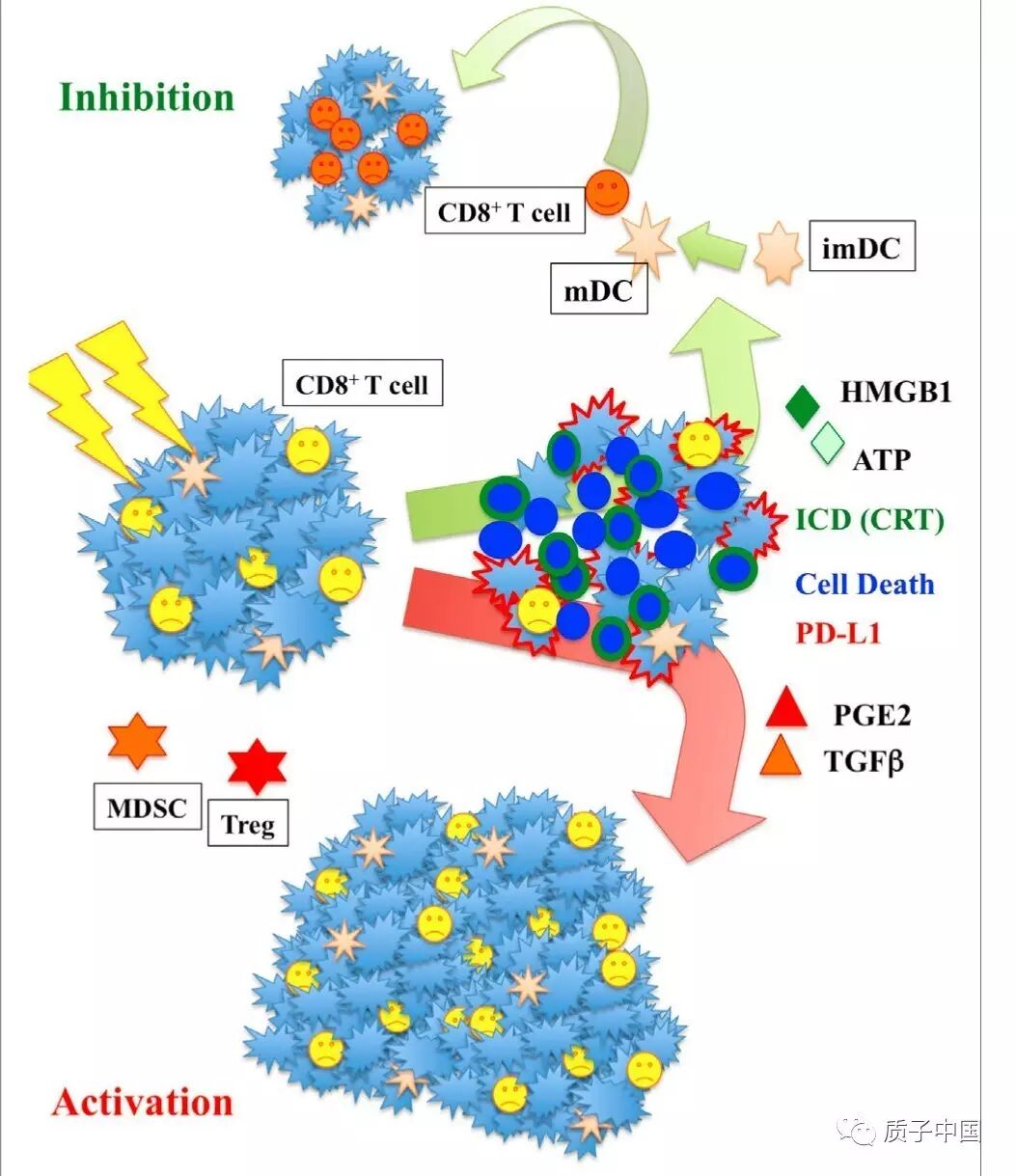 放射线照射后,HMGB1起到免疫激活细胞因子和DAMPs的作用,ATP和干扰素γ被释放。其他放射线相关次级免疫激活机制还包括CERAMIDE通路激活MHC-I等。