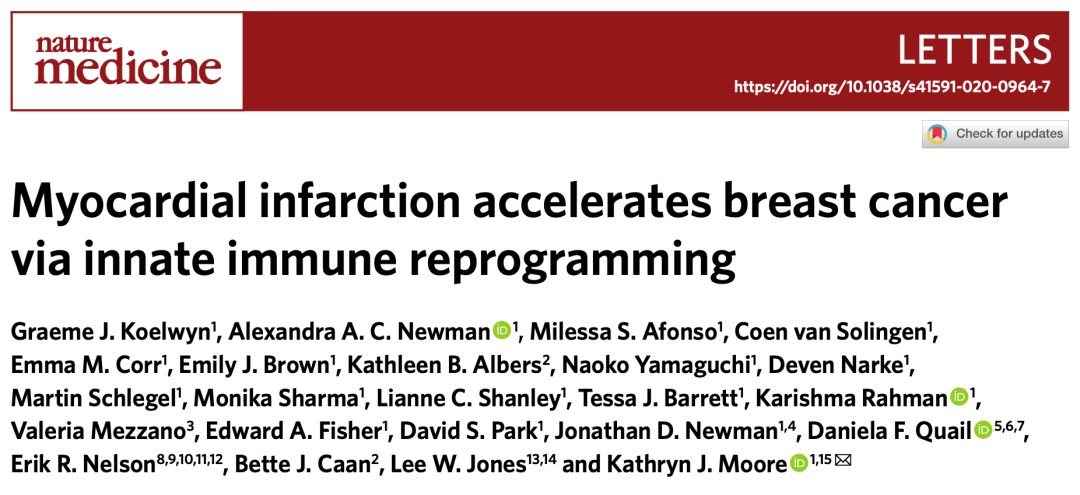 基于以上数据,Moore和她的同事认为,她们的研究结果表明,心肌梗死作为一种急性病理应激事件,可加速乳腺癌的进展和转移。从机制上讲,心肌梗死通过表观遗传学手段导致先天性免疫细胞的变化,形成一个全身性免疫抑制环境,促进肿瘤的生长和转移。