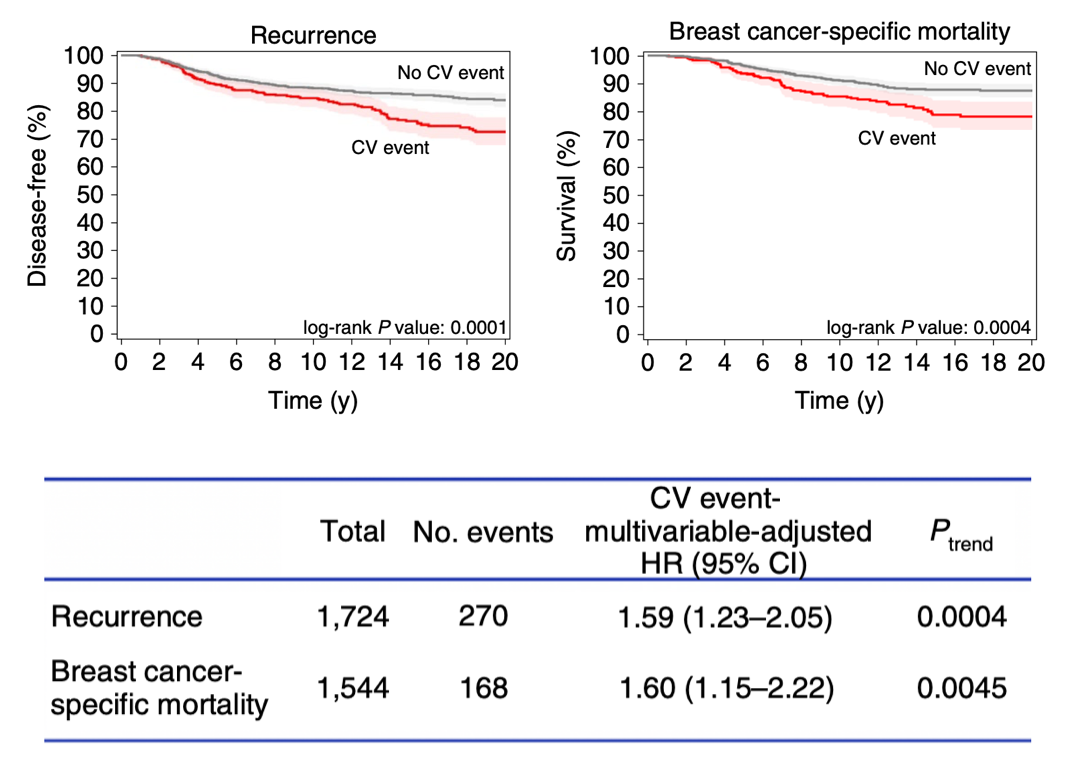 在诊断后平均11.7年的随访时间里,与没有出现心血管事件的患者相比,乳腺癌诊断后发生心血管事件与调整后的癌症复发风险增加59%,和乳腺癌特异性死亡率增加60%相关。