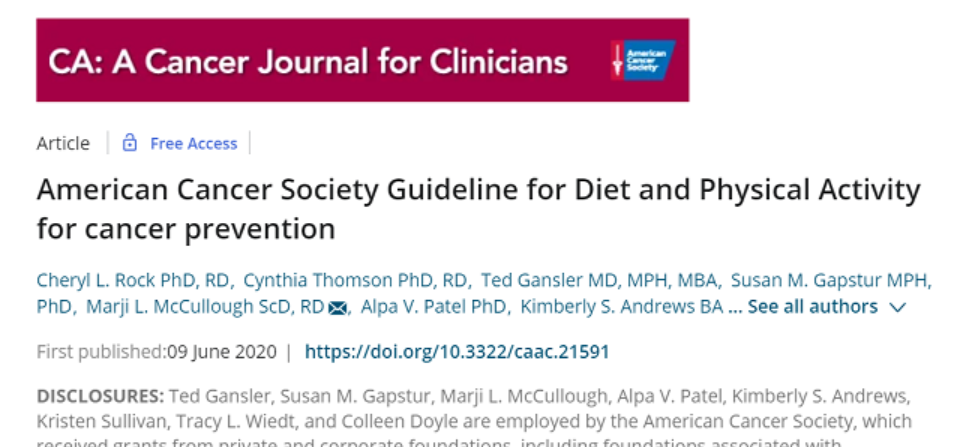 2020年6月9日,美国癌症协会刚刚更新了有关饮食和身体活动的预防癌症指南。并发表在美国癌症协会的同行评审杂志《CA:临床医生的癌症杂志》上。研究证实保持健康的体重,保持健康的生活,遵循健康的饮食习惯以及避免或限制饮酒可大大降低人一生中患癌症或死于癌症的风险。这份新指南详细介绍了降低癌症风险的最佳方法。