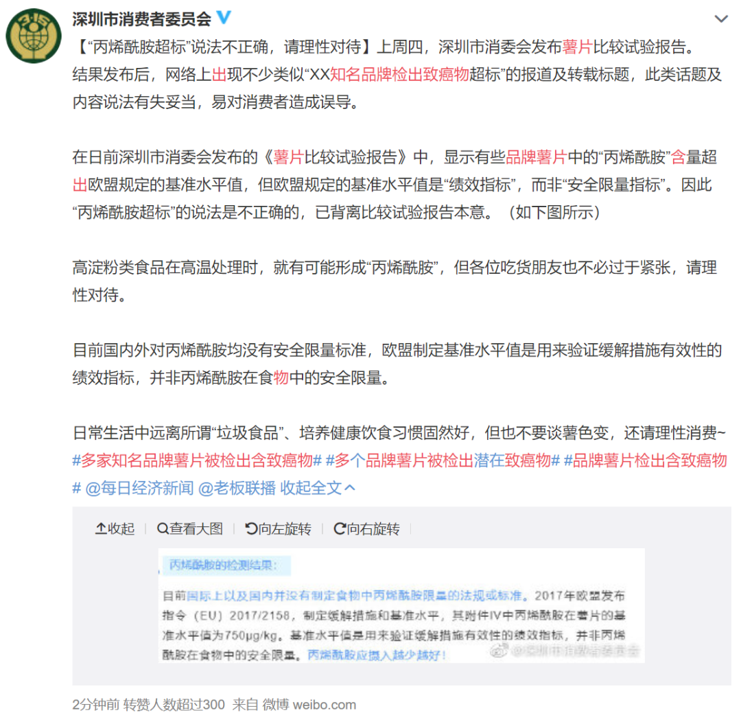 深圳市消费者委员会在《2020年薯片中外对比比较试验报告》里清楚地写出了对丙烯酰胺含量的看法: