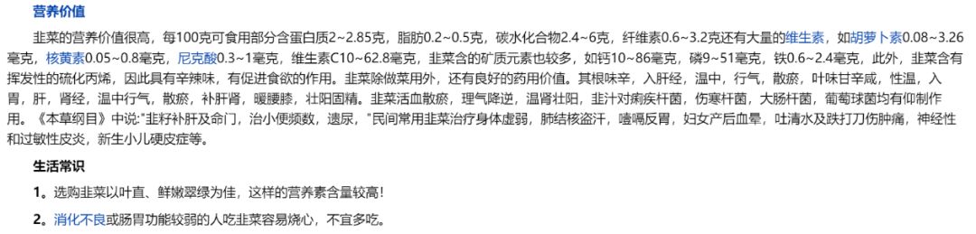 搜遍中文内容,只有几个网络的解答,“煞有其事”的说“乳腺癌患者阴虚火旺,吃韭菜身体会感觉不舒服,严重的话会影响睡眠…”、“韭菜含有大量硝酸盐,炒熟后可能转化为亚硝酸盐…”(不代表个人观点),但没有人用明确的数据和机制解释,用得最多的是“据民间传言”。 首先,就含硝酸盐量而言,据我国香港食物安全中心的报告,菠菜、甜菜根、白萝卜、苋菜等含量较高,而硝酸盐含量高低跟种植是否规范、烹饪方式极为相关。所以,硝酸盐含量应该不需要考虑太多,但不管什么蔬菜,尽量吃新鲜的。 其次,就是吃韭菜会让乳腺癌患者感觉不舒服,这种说法似乎有些道理,但我想问一句,吃什么东西不舒服为什么还要继续吃? 而且,医学百科里如下描述韭菜的营养价值(见下图)。 既然中文没搜到韭菜和乳腺癌,那去英文试试。 英文里也没有找到明确说韭菜的,在国外呆过的人也知道,国外的韭菜在超市里不怎么常见。但韭菜属于葱属,关于葱类与癌症关系的文章有一些。 葱属大约包括500种,常用的葱类蔬菜包括大蒜、洋葱、韭菜、细香葱等,在传统医学实践中,一些葱属被认为在抗菌、抗血栓、抗肿瘤、降血脂、抗关节炎和降血糖中有作用。近年来,一些研究集中于葱类蔬菜中的成分,即烯丙基硫化物和类黄酮(尤其是洋葱中大量存在的槲皮素)的抗癌潜力。流行病学研究表明,摄入更多的葱制品与降低几种癌症的风险有关,葱属蔬菜中存在有机硫化合物,有机硫化合物可以抑制突变、调节酶活性、清除自由基以及影响肿瘤生长等作用。尽管有大量证据支持这些机制,但它们仍是推测性的,还需要进一步的研究来支持葱属和癌症的关系。(这一段很难懂,请量力而行~) 总结而来,没有证据证明韭菜可以增加乳腺癌患病风险和乳腺癌复发转移风险,而从其营养价值和国外的文章看来,葱属蔬菜,可能降低消化道肿瘤甚至乳腺癌的患病风险。