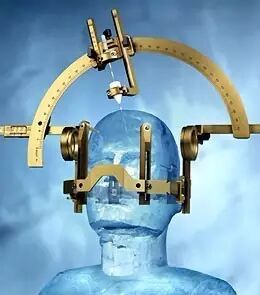 立体定向外科手术是一种微创的手术方式,使用三维坐标系统来定位体内小的目标,并实施一些操作例如消融,活检,注射,刺激,植入,放射外科治疗等。理论上来讲,体内任何器官系统都可以做立体定向外科手术。但是,困难在于设立一个可靠的参照系(例如与软组织有恒定空间关系的骨标志物),这意味着这种实施,传统上以及最近都局限于神经外科,因为颅内的组织和头骨的空间关系是恒定的。就算是这样,也需要采用外固定来固定头部。如下图所示。