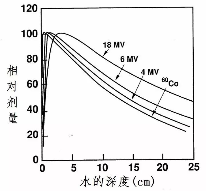 伽马刀使用的射线为伽马射线。放射性元素钴60通过贝塔衰变产生2种单能的伽马射线,分别为1.17 和 1.33 MeV。钴60伽马射线的深度剂量分布与4MV光子线类似。钴60的半衰期为 5.27年。由下图可以看出伽马刀对比其他光子放疗设备,能量是较弱的。