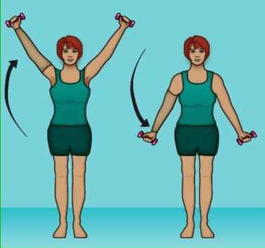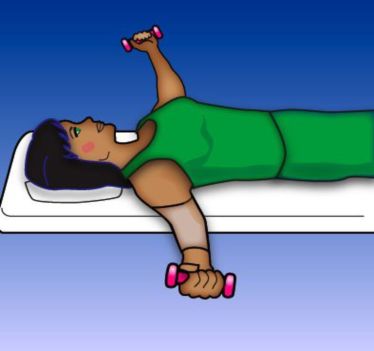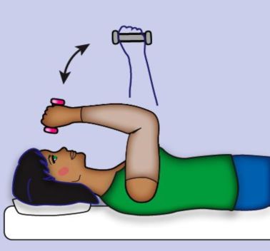乳腺癌术后可能会出现一些长期并发症,如手臂的淋巴水肿。水肿通常是由于腋窝淋巴结清扫或前哨淋巴结活检引起的,但少数未行淋巴结清扫的患者也可能会出现。放疗及术中对淋巴管的损伤,都可能导致过多的淋巴液积聚,引起手或胳膊的肿胀。而手臂肌肉的收缩可帮助身体重吸收淋巴液中的蛋白质,促进这些积聚的淋巴液回流入腋下和颈部的静脉,使之重回血液循环,从而减轻手臂的肿胀。本篇将教给大家如何科学的进行乳腺癌术后的手臂锻炼,帮助您减轻淋巴水肿,重拾美丽。 1.开始训练前将训练方法告知您的大夫,请他们帮助您进行更好的康复训练。 2.务必等伤口缝线及引流管移除后再进行此锻炼。 3.动作轻柔,避免过度拉扯您觉得痛的地方。如果感觉胳膊发胀或变红等不适,立即停止锻炼。 4.锻炼前请使患侧胳膊保持温暖,可以在锻炼前泡一个热水澡,穿上舒适宽松的衣服,另外一定要记得戴上您的加压袖套。 5.规律锻炼,持之以恒,您将看到明显的改变。三天打渔两天晒网是不行的。 6.锻炼中您将使用到以下物品:一组约450~500g的自由重量的装备(如哑铃等)、您的加压袖套、小的手握弹力球、一把硬椅子,以及一块足够躺下的地方。 1.坐姿锻炼:挤压球运动 如图所示,您可以只锻炼您的患侧胳膊,也可以两只胳膊一起锻炼。使用一个比手掌稍大一点的弹力球,球不要太重,并且能够在您握持的时候有一定回弹的阻力。在不断的挤压、释放的过程中,您会感到手掌和手臂的肌肉在收缩、放松。 具体做法如下:患肢佩戴加压袖套,在硬椅子上坐直(站立也可),肩膀放松,保持背部和颈部直立。握住弹力球,在面前伸直胳膊,升高至高于心脏的位置。用手指捏球,挤压3秒然后释放。重复练习5~7次。如果觉得疲劳,可以休息一会儿再继续锻炼。 2.坐姿锻炼:肘关节屈曲 如图所示,肘关节屈曲运动可帮助您练习您的上部手臂肌肉,这是接近腋窝淋巴结的地方。当这些肌肉在运动时,淋巴液可以得到回流和吸收,以减少手臂淋巴水肿。 具体做法如下:坐姿同上,手持450~500g的哑铃,把手放在大腿上。慢慢地弯曲你的肘部,两个手贴向胸口。每次屈曲一半时保持该姿势6秒,然后继续。动作缓慢轻柔,重复此练习10次,感到不适及时停止。随着肌肉力量的提升,可以在自己感到舒服的范围内,逐步换用更大重量的哑铃。 3.地板锻炼:肘伸展 如图所示,您可以在平躺姿势下用双臂做肘关节伸展运动。 具体做法如下:平躺,保持背部和颈部在一条直线,双脚双膝分开与肩同宽。每只手握450~500g的哑铃,双臂与肩同宽。伸直双臂,缓慢向胸部屈曲,屈曲至90°时保持该姿势6秒,然后继续伸直-屈曲。动作缓慢轻柔,重复此练习10次,感到不适及时停止。随着肌肉力量的提升,可以在自己感到舒服的范围内,逐步换用更大重量的哑铃。 4.地板锻炼:肩部外展内收 如图所示,平躺后做肩部外展内收动作。 具体做法如下:平躺姿势及负重方式同上,保持双臂肘关节伸直,缓慢移动到胸前,双手尽量能合十,在此姿势上保持6秒,然后继续伸直-屈曲。动作缓慢轻柔,重复此练习10次,感到不适及时停止。随着肌肉力量的提升,可以在自己感到舒服的范围内,逐步换用更大重量的哑铃。 5.站姿锻炼:肩部伸展 如图所示,保持良好站姿后做肩部伸展动作。 具体做法如下:保持良好站姿,掌心朝向身体,缓慢举起双臂直至到头顶,在此姿势上保持6秒,然后缓慢放下手臂。整个过程动作务必缓慢,感受力量的控制和肌肉的运动。重复此练习10次,感到不适及时停止。随着肌肉力量的提升,可以在自己感到舒服的范围内,逐步换用更大重量的哑铃。 6.站姿锻炼:肩部外展 如图所示,保持良好站姿后做肩部伸展动作。 具体做法如下:保持良好站姿,掌心向前,缓慢在两侧举起双臂直至头顶,在此姿势上保持6秒,然后缓慢放下手臂。整个过程动作务必缓慢,感受力量的控制和肌肉的运动。重复此练习10次,感到不适及时停止。随着肌肉力量的提升,可以在自己感到舒服的范围内,逐步换用更大重量的哑铃。 7.站姿锻炼:持杆走 如图所示,持杆走又称为Nordic wALKing,运动全身肌肉和关节,尤其是手臂、肩部及胸背部的肌肉。 具体做法如下:使用一组带手柄的健身步行杆。行走时两极应该保持在你的步幅后面, 并始终指向对角向后。这些将帮助你锻炼你的肩部和平衡感,支撑膝关节和腿部的肌肉。右脚向前一步,摆动左臂到腰部高度,同时左杆击中右脚后面的地面。保持躯干直立,不要前倾。锻炼强度在您可以接受的范围内即可。 上述练习可以帮您减轻乳腺癌术后的手臂淋巴水肿症状,需要再次强调的是,一定要等到乳腺癌手术痊愈后再开始这些练习。 如果您已经痊愈,从现在就开始做吧,以后的每一天,你都将拥抱更美好的自己。一.进行手臂锻炼前的准备