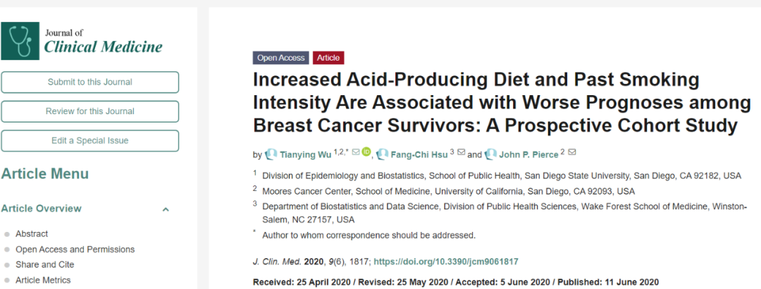 近日,来自美国加利福尼亚大学的研究人员在《Journal of Clinical Medicine》上发表了其对饮食偏好和既往吸烟史对乳腺癌患者预后影响的最新研究成果,发现饮食中酸摄入量的增加和过去吸烟强度的升高既独立又共同与总死亡率和乳腺癌特异性死亡率的升高相关,且具有既往吸烟史的女性患乳腺癌的风险会显著增加。