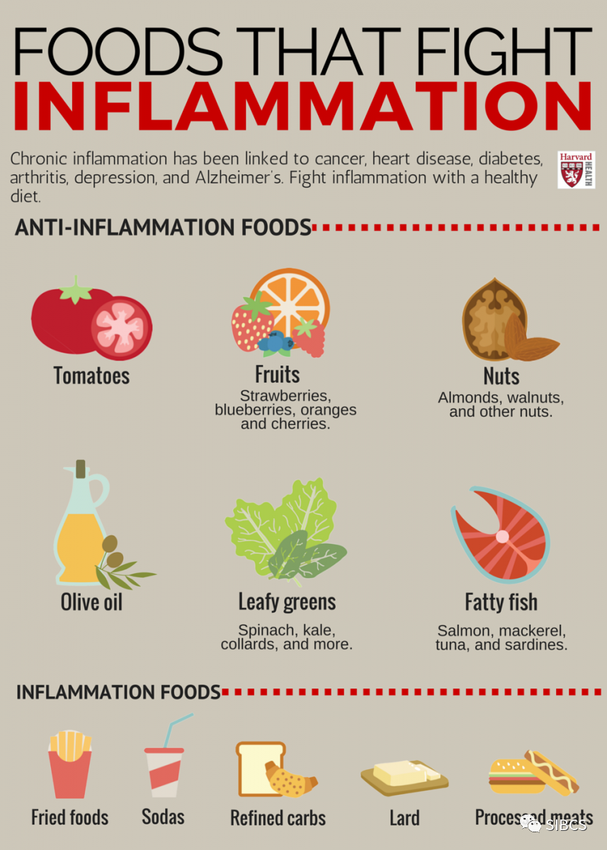 不过,南卡罗来纳大学的饮食炎性指数比较费解,下面这张哈佛大学医学院的图比较通俗易懂,总的原则就是多吃蔬菜、水果、坚果、深海鱼、橄榄油之类天然新鲜食品、少吃过度加工食品,具体可以咨询医院营养科医师。
