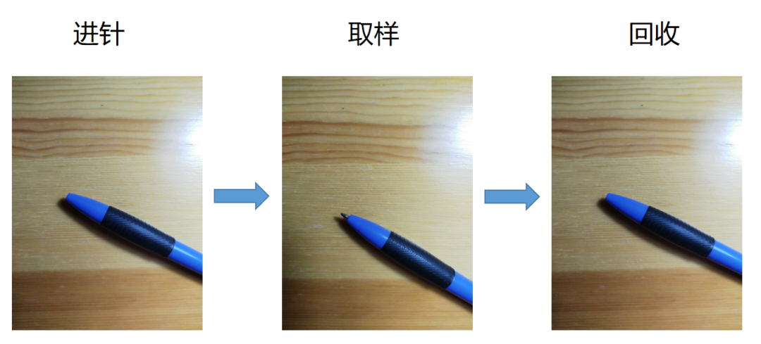 取样之后将内部的细针收回套管,就像再次将圆珠笔的笔芯收回;