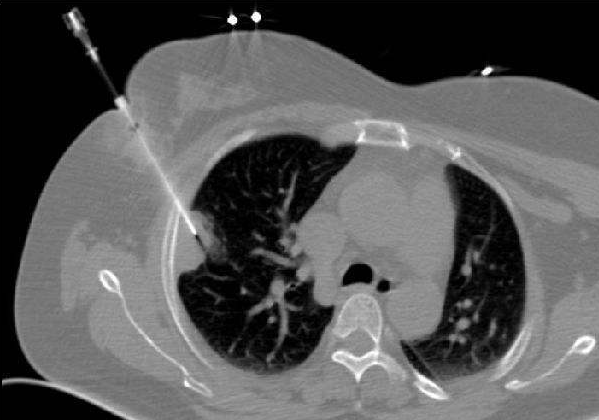 在CT上看到针头已经十分接近要活检的病灶时,伸出内部的细针,就像按出的圆珠笔;