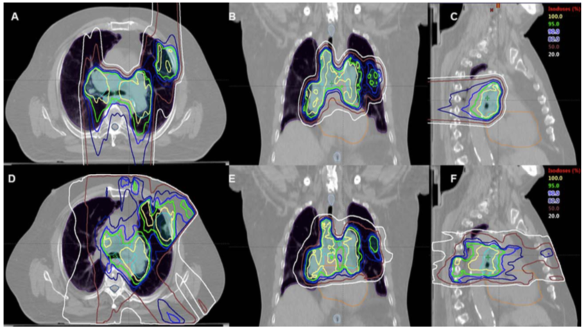 示例:74岁女性患者,局限期小细胞肺癌,累及右肺下叶、右肺门,伴纵隔淋巴结转移。质子治疗计划的轴向图(A)、冠状图(B)和矢状图(C)。 (D–F)为相应的IMRT治疗计划图。计划靶区(PTV)以青色显示。