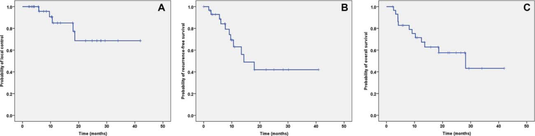 Kaplan-Meier生存曲线:局部控制率(A)、无复发生存率(B)、总生存率(C)。