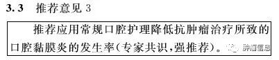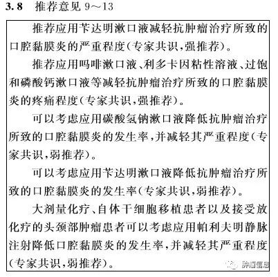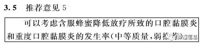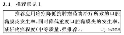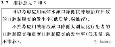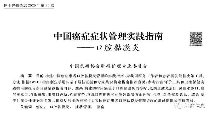 今天看到一个说法,口香糖可以降低抗肿瘤药物引起口腔粘膜炎的发生率,这是真的吗? 答案是:真的,而且这个说法来自专业指南推荐。不光是口香糖,蜂蜜、冰水、激光、蒸馏水都可以预防或治疗抗肿瘤药物引起的口腔粘膜炎。 一起来看一下这个共识推荐: 注:冷疗就是在大剂量快速输注半衰期短的抗肿瘤化疗药前、中或后,口含冰水或冰块,一般持续30分钟。 机理:低温引起口腔粘膜血管收缩,减少口腔粘膜对毒性药物的暴露。 奥沙利铂禁用。 机理:成熟蜂蜜具有高酸度、高渗透压的特性,且含有葡萄糖氧化酶系统,可以抑制细菌生长,促进细胞上皮再生长。 机理:口香糖可以刺激唾液分泌,中和口腔酸性,并防止口腔干燥。 蒸馏水为低渗溶液,无味、无刺激性,患者应用后口感舒适。 具体推荐意见解读请看原文。 本文来源: