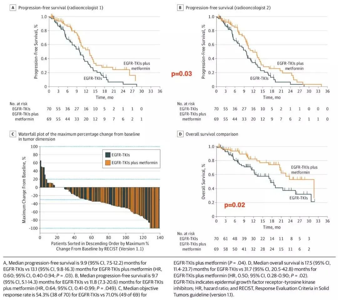 而在2019年9月5日,来自墨西哥国家癌症研究所等机构的科学家在 JAMA Oncology 上报道了第一项评估二甲双胍与EGFR-TKIs联合治疗EGFR突变晚期非小细胞肺癌的前瞻性Ⅱ期试验结果。