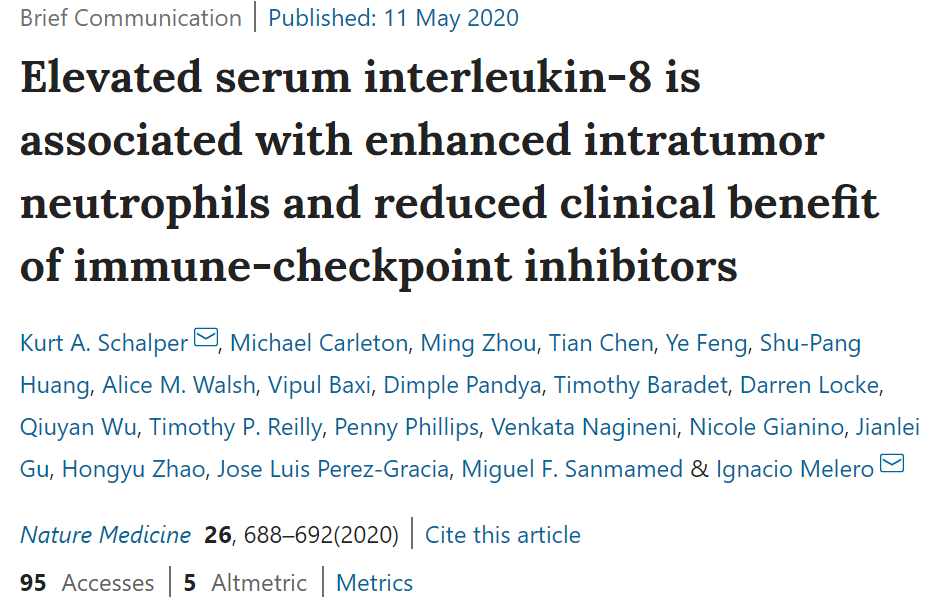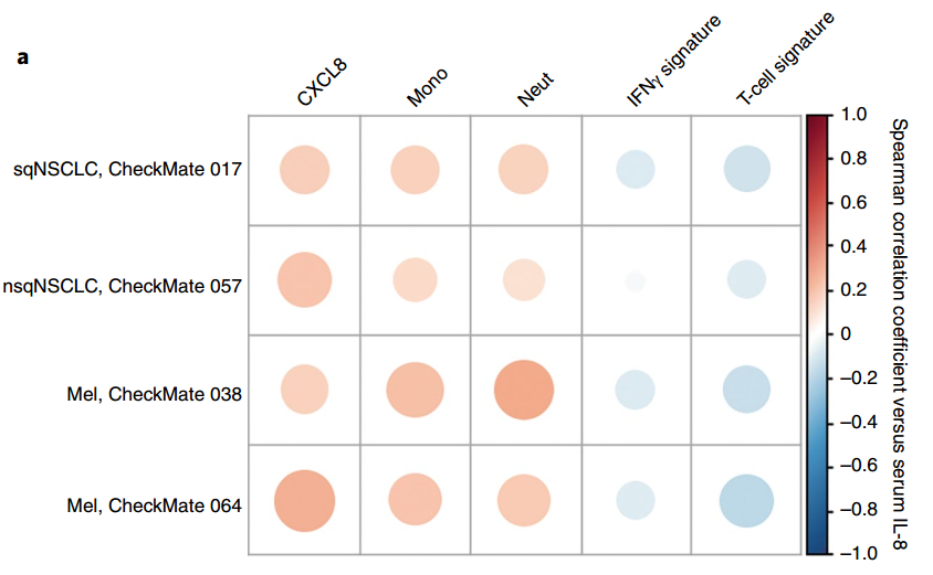 免疫治疗可以说是肿瘤治疗的一场翻天覆地的革命,它改变了诸多癌种的治疗范式,但是并不是所有的患者都能够从免疫治疗中受益,而到底哪些患者敏感、哪些患者耐药,则需要寻找有效的生物标志物来预测。 关注免疫治疗的读者想必此时该会心一笑,这应该算个老大难问题了。PD-L1水平、肿瘤突变负荷(TMB)等等标志物已经有一些研究支持,但是至今我们还没有一个预测效果好、又方便测定的标志物。 近期,《自然医学》杂志背靠背发表了两项研究,提出了一种新的预测标志物,血浆白介素-8(IL-8)水平!两项研究分别回顾了有关PD-1抑制剂和PD-L1抑制剂的临床研究,分析了近3000名患者,发现基线IL-8水平与预后不良显著相关[1,2]! 进一步分析显示,高IL-8水平与更高的肿瘤嗜中性粒细胞/单核细胞浸润、更差的T细胞功能、更弱的抗原递呈有关。 一方面,IL-8水平可以作为免疫治疗受益人群的标记物;另一方面,以高IL-8表达作为靶点,开发新的治疗方法,或许是免疫检查点抑制剂耐药的一个关键破局点。 高IL-8水平与免疫抑制细胞肿瘤浸润、T细胞功能不良、患者预后更差有关 IL-8是一种细胞因子,有CXCR1和CXCR2两个受体。IL-8由单核细胞、内皮细胞和各种上皮细胞产生,参与感染反应、炎症反应和癌症发生[3]。IL-8可以招募嗜中性粒细胞,刺激血管生成和肿瘤细胞的增殖,此前研究也有发现,较高的IL-8水平与肿瘤分级/分期更晚、肿瘤负荷更高有关[3,4]。 但是,IL-8与免疫治疗预后之间的关系,尚且还没有在大规模的临床研究中得到证实。 第一篇论文来自耶鲁大学医学院、百时美施贵宝等多家机构和企业的研究人员。研究团队通过回顾分析四个随机的3期临床试验,评估了血清IL-8水平对晚期癌症患者抗肿瘤预后的影响,并研究了血清IL-8水平与已知的免疫治疗生物标记物(例如PD-L1和TMB(肿瘤突变负荷))之间的关联以及肿瘤的免疫状况。总共纳入了4项3期临床研究,CheckMate 067(黑色素瘤)、CheckMate 017(鳞状非小细胞肺癌)、CheckMate 057(非鳞状非小细胞肺癌)和CheckMate 025(肾细胞癌),调查了1344名患者的血浆IL-8水平。 总的来说,有27.1%-34.3%的患者基线血浆IL-8水平≥23pg/ml,这部分患者明显总生存期更短。影响最严重的还要数在CheckMate 067研究中采用PD-1+CTLA-4双免疫治疗联合的黑色素瘤患者,高IL-8与低IL-8水平患者之间的生存风险比竟然超过3倍。 不过,IL-8与预后的负相关也不仅限于双免疫这一组,免疫治疗单药、双药、与mTOR抑制剂依维莫司联用或与化疗多西他赛联用,都表现出了这一相关性。 另外,分析结果显示IL-8水平和PD-L1表达相关性很低,可以认为IL-8对生存的影响是独立的。 高IL-8水平患者OS更短 为了进一步评估IL-8的作用,研究者们还分析了血浆IL-8水平、肿瘤关键免疫转录物质的表达以及循环免疫细胞群之间的关系。血浆IL-8水平与肿瘤中CXCL8基因表达、嗜中性粒细胞/单核细胞计数呈正相关。肿瘤中IL-8的水平则与肿瘤中IFN-γ、T细胞浸润相关转录负相关。 这说明,IL-8存在对适应性免疫的抑制作用,影响抗原递呈和效应T细胞的抗肿瘤活性,肿瘤来源的IL-8还与免疫耐受髓样细胞浸润有关系。 红色表示正相关,蓝色表示负相关 大小表示相关性强弱 第二项研究关注的则是PD-L1抑制剂,纳入了3项临床研究:IMvigor 210(转移性尿路上皮癌,2期)、IMvigor 211(转移性尿路上皮癌,3期)、IMmotion 150(转移性肾细胞癌,2期)。研究分析了所有1445名患者的血浆IL-8,还进一步评估了肿瘤及外周血单核细胞的RNA表达。 与第一项研究结果类似,IL-8水平较高同样与较差的预后有关。另外,这项研究中有一个小小的新发现,虽然在统计学上没有显著差异,但是血浆IL-8水平对免疫治疗单药组的影响似乎比联合用药组更加明显。 高IL-8水平患者预后更差(局部) 研究者进一步对5名响应免疫治疗的患者和5名耐药患者的外周血单核细胞亚群进行了RNA测序。 IL-8在髓细胞中表达更高,且与响应免疫治疗的患者相比,耐药患者体内产生IL-8的髓细胞和淋巴细胞比例更高,IL-8水平也更高。在IL-8高表达的髓细胞中,炎症基因表达更高,与抗原递呈相关的基因,比如人类白细胞抗原(HLA)和IFN-γ诱导基因都有所下调。 同样的,研究者也发现,IL-8也存在对T细胞功能的抑制。在低IL-8水平的患者中,CD8+T细胞活化标记表达水平更高。这表明高IL-8很可能导致对抗肿瘤免疫的抑制,而靶向IL-8则是破解免疫治疗耐药的一种潜在方法。 响应免疫治疗和耐药患者之间IL-8表达存在显著差异 总结一下,这两项研究提出,IL-8可能是免疫检查点抑制剂耐药的驱动因素。除了对直接执行抗肿瘤免疫的T细胞的影响之外,免疫抑制性髓细胞的浸润也是关键。 寻找免疫治疗预后标志物是长期以来科学家们的努力方向,血浆IL-8水平则为我们提供了一个新的可靠的、容易测量的选择。当然,这还需要前瞻性研究的进一步验证。 在两篇论文来的最后,研究人员都提出了可开发靶向IL-8的癌症候选药物的观点。 希望免疫治疗越走越好。