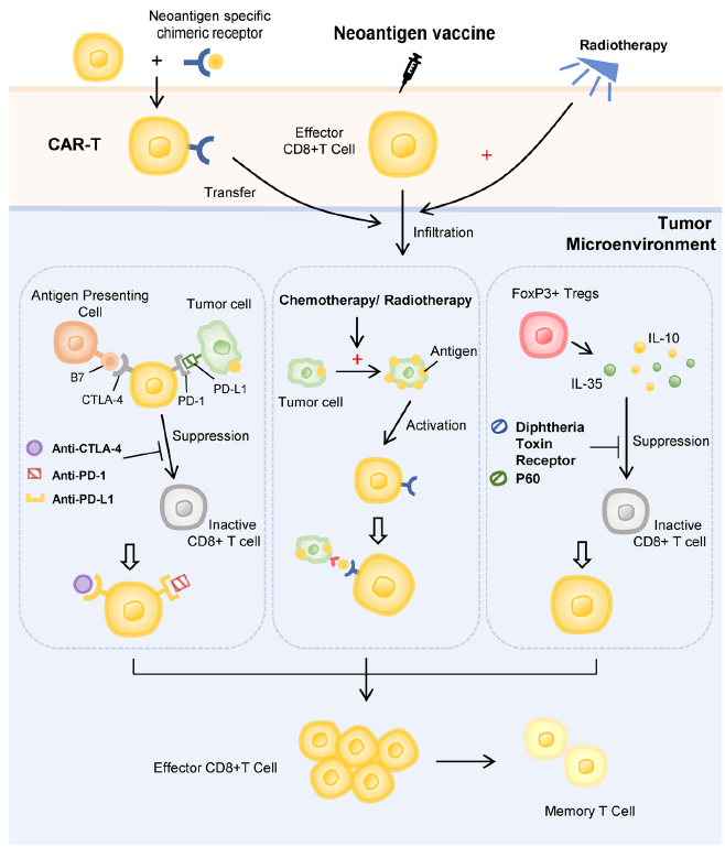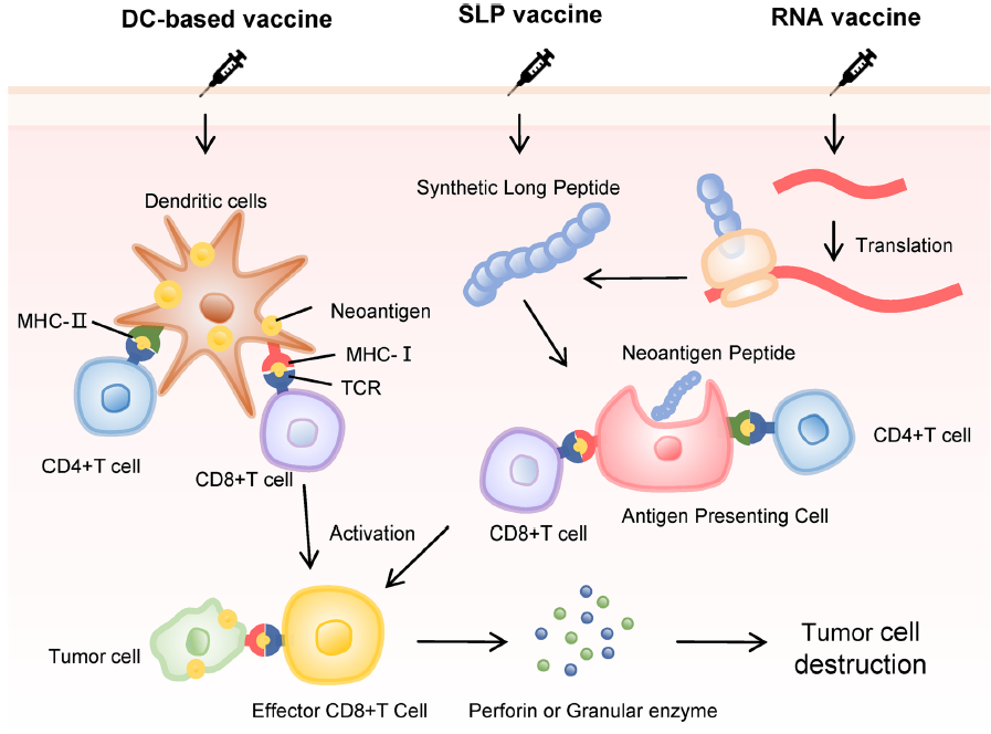 高度变异且快速增生的肿瘤细胞往往导致细胞内的遗传不稳定性(genetic instability),并发生大量的基因突变。癌细胞中普遍存在的基因突变及其产物是健康细胞和正常基因组中所没有的,而非同义(non-synonymous)突变的表达可以产生肿瘤特异性抗原,即所谓的新抗原(neoantigens)。它们不仅是肿瘤特异性抗原,而且由于不存在中枢性耐受的基础环境,可能带有高度免疫原性,激活CD4+、CD8+T细胞产生免疫应答,成为肿瘤免疫治疗的新靶点,且具备构建癌症疫苗的理想条件。 近年来,肿瘤免疫治疗已成为消除恶性肿瘤的新途径。抗体介导的免疫检查点阻断消除了肿瘤细胞对免疫细胞的抑制作用,达到了抗肿瘤的效果;但在许多情况下效果有限,特别是在实体瘤中的应答率较低。过继性T细胞疗法,则是在体外激活和扩增患者的自体T淋巴细胞,再将它们回输病患体内杀死肿瘤细胞,临床试验取得了显著的效果。然而,对实体瘤的疗效也有限,且过继性T细胞体内持久性差、会产生细胞毒性,并引发炎症因子风暴。 低免疫原性也是肿瘤免疫逃逸的另一个关键原因。因此,寻找免疫原性更强的新抗原已成为免疫治疗的新突破口。由于测序技术和生物信息演算法的进展,科学家们也了解MHC主要蛋白在抗原提呈中的作用,实现抗原特异性T淋巴细胞的体外增殖,因此可利用分子生物学技术克隆和表达基因,为新抗原的分子鉴定提供了必要的支持。 新抗原(neoantigens) 肿瘤细胞与正常细胞的本质区别之一 新抗原是一种非自体(Non-self)特异性蛋白,是由肿瘤细胞基因组中的非同义突变产生的。突变序列与原编码序列的差异越大,异常蛋白的“非自体”特征越明显,免疫原性越强。点突变占肿瘤细胞突变中的95%,而插入/缺失(insertion-deletion)和移码(frame shift)突变仅占5%,但引起的氨基酸序列和空间结构变化更为明显,突变多肽对MHC的亲和力更强,更容易被T细胞识别为新抗原。由于大部分的肿瘤免疫原性低,或患者自身免疫系统功能下降,T细胞自发识别内源性新抗原的比例仅约为1-2%,因此在获得有效新抗原的基础上设计特异性疫苗将是一种有效的肿瘤免疫治疗方法。 如何鉴別与预测新抗原?! 新抗原具有高度的个体特异性,通常不涉及已知的癌基因。新抗原识别的第一步通常是利用高通量测序技术快速比较肿瘤细胞和正常细胞的DNA序列。测序深度、肿瘤组织质量、测序材料来源、单核苷酸变异演算法等因素都会影响新抗原的鉴定。目前,大多数新抗原是通过全外显子(whole-exon)测序技术鉴定的。 然而突变基因序列能否形成肿瘤新抗原取决于以下几个因素: ① 突变基因序列能否转译为蛋白; ② 突变蛋白能否加工成多肽并成为抗原提呈; ③ 突变多肽与患者MHC分子的亲和力; ④ 突变多肽-MHC复合物与T细胞受体(TCR)的亲和力。 因此,预测新抗原不仅需要鉴定基因组表达的突变,还需要患者MHC类型的数据。目前已有种类繁多用于新抗原鉴定的应用软件,但是由于MHC-II结构的独特性和多肽与MHC-II分子结合过程的复杂性,缺乏强大而丰富的相互作用数据库,因此需要进一步发展生物信息学来提高对新抗原的鉴定和评价。 目前也有多种平台可帮助筛选与鉴定新抗原,如结合全外显子序列与质谱技术筛选新抗原的工作流程,或通过共享新抗原库进行新抗原筛选,或通过胞啃作用(trogocytosis)筛查新抗原。 新抗原疫苗 与普通的预防性疫苗不同,肿瘤疫苗是提供恶性肿瘤患者注射治疗。肿瘤新抗原疫苗作为非自体抗原,暴露于MHC分子,以激活患者的自身免疫反应并杀死肿瘤细胞。肿瘤疫苗的治疗效果往往取决于肿瘤细胞与正常细胞靶向抗原表达的差异。新抗原不仅能增强抗肿瘤作用免疫反应,还可以降低自体免疫的风险。 因此,新抗原激活的T细胞能产生高活性的T细胞,其TCR对MHC-新抗原多肽-复合物有较强的亲和力,可避免中枢免疫耐受清除。在癌细胞基因组中的非同义突变,驱动突变(driver mutation)为癌细胞提供了选择性生长的优势,且具有明显的克隆倾向,可能存在于肿瘤组织的所有细胞中。 由于测序技术的迅速发展和生物信息学演算法的不断优化,使研究人员现在能够准确识别肿瘤新抗原并预测其MHC亲和力和免疫原性,从而发展出个性化的医学。根据识别的新抗原或驱动抗原,设计了多种肿瘤细疫苗,包括长肽(SLP)疫苗或蛋白疫苗、基因(RNA/ DNA)疫苗和DC疫苗。 新抗原疫苗类型。在体内新抗原最终呈现给CD4+T细胞和CD8+T细胞,以诱导特异性免疫反 应并达到抗肿瘤的效果。Adapted from Peng et al. Molecular Cancer (2019) 18:128 新抗原疫苗与其他疗法的联合治疗策略 研究表明,肿瘤疫苗联合免疫抑制疗法比单一疗法更有效。结合新抗原疫苗和检查点抑制疗法可以减轻肿瘤细胞对效应T细胞介导的抑制作用;放化疗可以辅助疫苗发挥更好的效果。结合CAR-T治疗,体外培养特异性靶向新抗原的T细胞,再注入患者体内产生效应T细胞和记忆T细胞,从而增强抗肿瘤作用。 Adapted from Peng et al. Molecular Cancer (2019) 18:128 作为一种新兴的抗肿瘤免疫疗法,新抗原疫苗已经在多个试验取得预期治疗效果,在一定程度上提高了患者的生活质量,延长了患者的生存期。基于SLP、RNA、DNA和DC的疫苗,以及其他类型的疫苗,也显示出极佳的安全性和有效性。而生物信息学的发展并结合多种先进的筛选平台可进一步提高对新抗原的识别和鉴定,有助于开发更有效的肿瘤