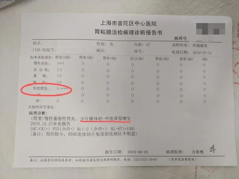 随着人们健康意识的提高和胃镜检查的普及,越来越多的人拿着“上皮内瘤变(或异型增生)”的胃镜报告忧心忡忡,忙着上医院问个究竟。 听了医生的解释才知道:原来胃上皮内瘤变旧称异型增生,是指胃黏膜上皮肿瘤性增殖未向黏膜固有层浸润前的病变,主要表现为胃黏膜细胞学异常和上皮结构异常,是最重要的胃黏膜癌前病变,代表肿瘤性生长的起始阶段。 中医认为本病属于“胃痛”、“痞满”等范畴。病因包括:1、先天禀赋不足,有家族遗传史;2、体虚久病劳累,脾胃虚弱;3、饮食不节,脾胃受损;4、起居失常,经常熬夜;5、外邪(寒邪、病菌)犯胃,伤及胃腑;6、情志失畅,肝胃不和。 对于胃上皮内瘤变的治疗,现代医学到目前为止还缺乏理想的方法和手段,主要是对症处理及消除症状:抑酸、促胃动力、黏膜保护、根除幽门螺杆菌,助消化剂、补充维生素B族等,还可进行内镜或外科手术治疗。 中医中药治疗胃上皮内瘤变进行了大量的临床实践和基础研究,有健脾益气、活血化瘀、养阴增液、理气消胀、清热解毒、化痰软坚等不同治疗原则,方药选择上有辨证分型论治、基本方结合辨证加减及固定专方的不同,取得了一定的临床疗效。 我们课题组经过十多年的研究发现,气虚血瘀、痰热壅积是该病的主要病理基础。临床应用益气消积法中药进行个体化综合治疗,大多数胃上皮内瘤变是可以消除和逆转的。下面就为你支几招: 1、调整饮食:每日三餐有节律,避免辛辣刺激、腌制高盐食物,控制油腻,限酒。 2、改变生活方式:起居有常不熬夜,戒烟,适当运动,使用公筷。 3、调畅情志:不生气发怒,不焦虑紧张,树立战胜疾病的信心。 4、注意保暖,讲究个人卫生。 5、遵守医嘱:长期规律随访以及定期胃镜检查。 6、积极治疗:治病求本,益气扶正很重要,常用生晒参、党参、黄芪、冬虫夏草、女贞子、枸杞、白术、茯苓、山药等。兼顾治标,常用半夏、莪术、白花蛇舌草、藤梨根、黄连等。 7、辅助治疗:舌质紫黯,可用三七煮水;舌苔腻,可用米仁煮水;消化不好,可用山楂、谷芽、麦芽、陈皮煮水。 8、因人而异,辨证论治:胃上皮内瘤变需要专业医生进行诊治,一般3个月为一个疗程,治疗1~2个疗程可以复查胃镜。 中医讲究“既病防变”,促进胃上皮内瘤变逆转和消失是预防胃癌的有效措施。祝你早日与胃上皮内瘤变分手,远离胃癌! 某男,46岁,因胃脘痞满一年余加重一月,于2019年8月29日来余门诊求治。胃镜示:慢性萎缩性胃炎(糜烂性),病理示:(胃窦)慢性萎缩性胃炎,少许腺体轻-中度异型增生(注:低级别上皮内瘤变)。查体:舌黯,边有齿印,苔薄白,脉弦细。 予益气消积、理气和胃中药加减治疗3个月,症状完全消失。2019年12月10日复查胃镜示:慢性非萎缩性胃炎,病理示:(胃窦)慢性中度非萎缩性胃炎(糜烂性)。 专家门诊时间:周一下午,周二上午 特需门诊时间:周四下午 韩吉,主任医师,硕士生导师。于上海普陀区中心医院和上海中医药大学从事临床医疗、教学和科研工作二十余年,主要从事脾胃病中医药临床和实验研究工作。临床依据中医整体理论辨证施治,处方严谨,擅长运用中医药调治各种异常体质。尤其对慢性胃炎伴萎缩、肠化和上皮内瘤变、胃肠道息肉、胃食管反流病、慢性肠炎、溃疡性结肠炎等疾病疗效显著。调养建议