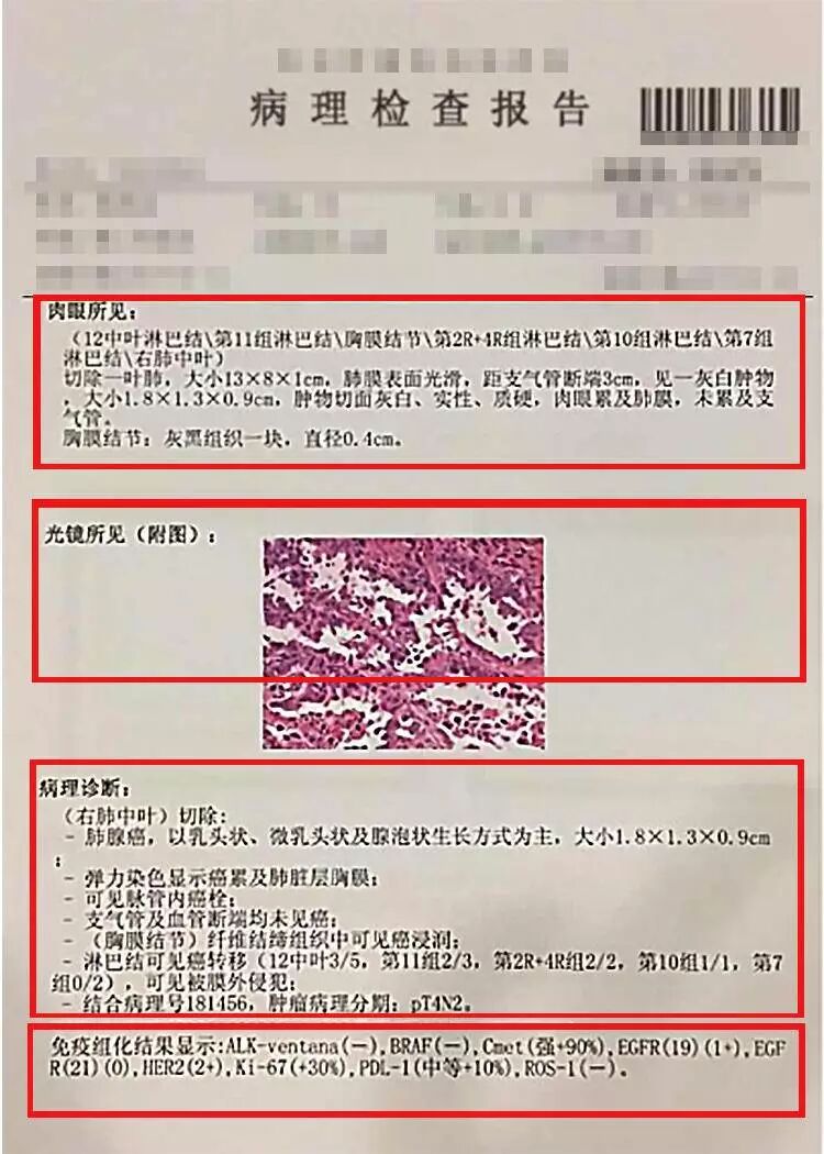 以上面的病理报告为例,该患者为:右肺腺癌,侵及胸膜,可见脉管癌栓,有淋巴结转移,病理分期pT4N2,预后不佳,需要积极术后辅助治疗,根据免疫组化c-Met(强+90%)提示可用c-Met抑制剂克唑替尼、cabozantinib/ target=_blank class=infotextkey>卡博替尼;PD-L1(中等+10%)提示可应用免疫治疗。